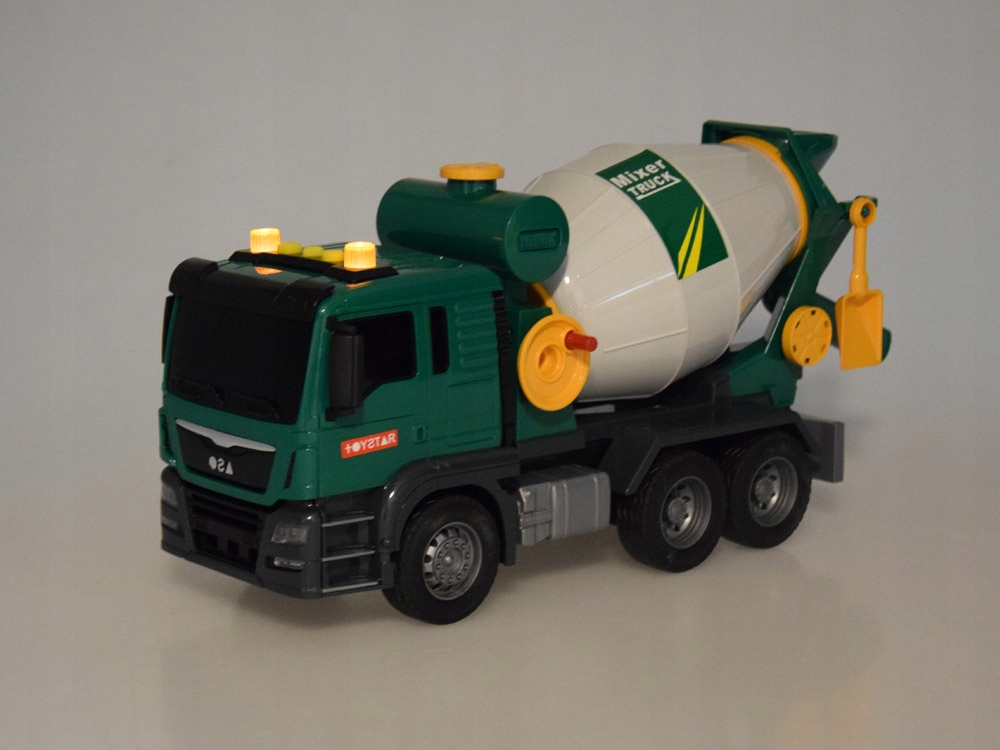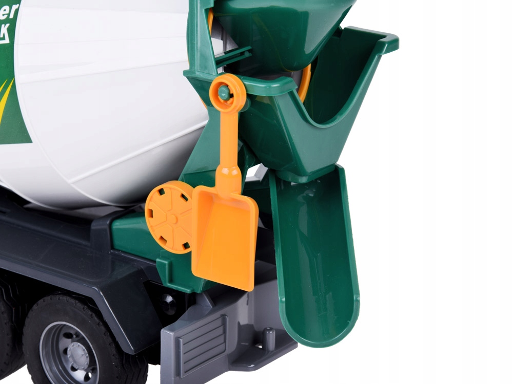 Zielona betoniarka to idealna zabawka dla małych miłośników pojazdów budowlanych. Została wyposażona w efekty dźwiękowe oraz ruchome elementy, które dodają realizmu każdej zabawie. Bęben betoniarki można obracać, imitując mieszanie betonu, a funkcjonalny lejek umożliwia "wylewanie" mieszanki.