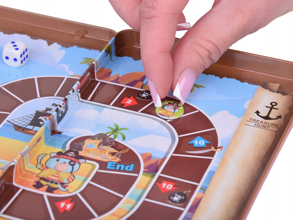 - Wygrywa gracz, który dotrze do skarbu z idealną precyzją, tzn. jeśli kostka wskaże większą liczbę, niż jest potrzebna do dotarcia do skarbu, pirat powinien udać się do skarbu, a następnie cofnąć się zgodnie z liczbą wyrzuconych oczek na kostce.