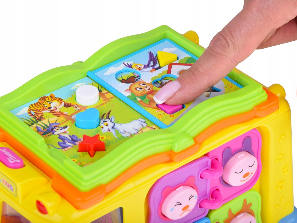 Z przodu autobusu znajduje się kolorowy obrotowy wałek ze zwierzątkami, który po przekręceniu powoduję uruchomienie odgłosy śmiejącego się dziecka i melodyjki.